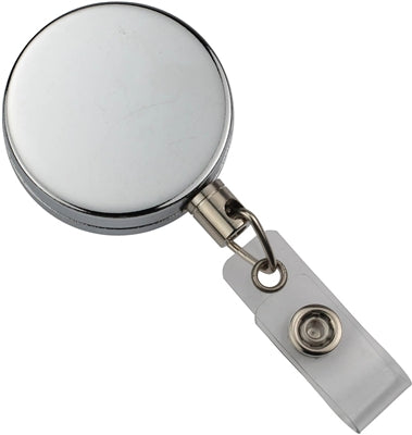 • Metal case heavy-duty round badge reel with wire cord, clear vinyl strap and belt clip.